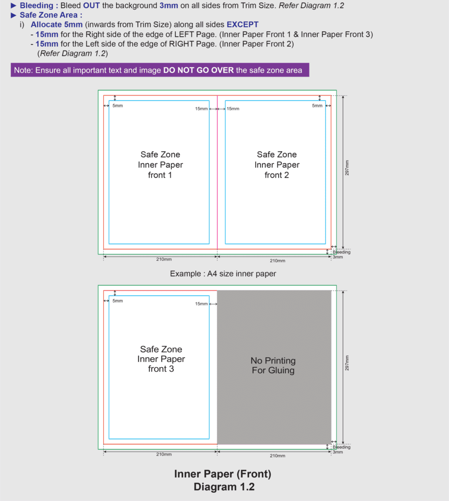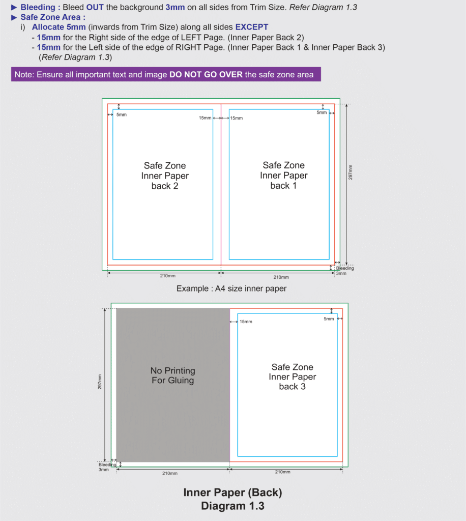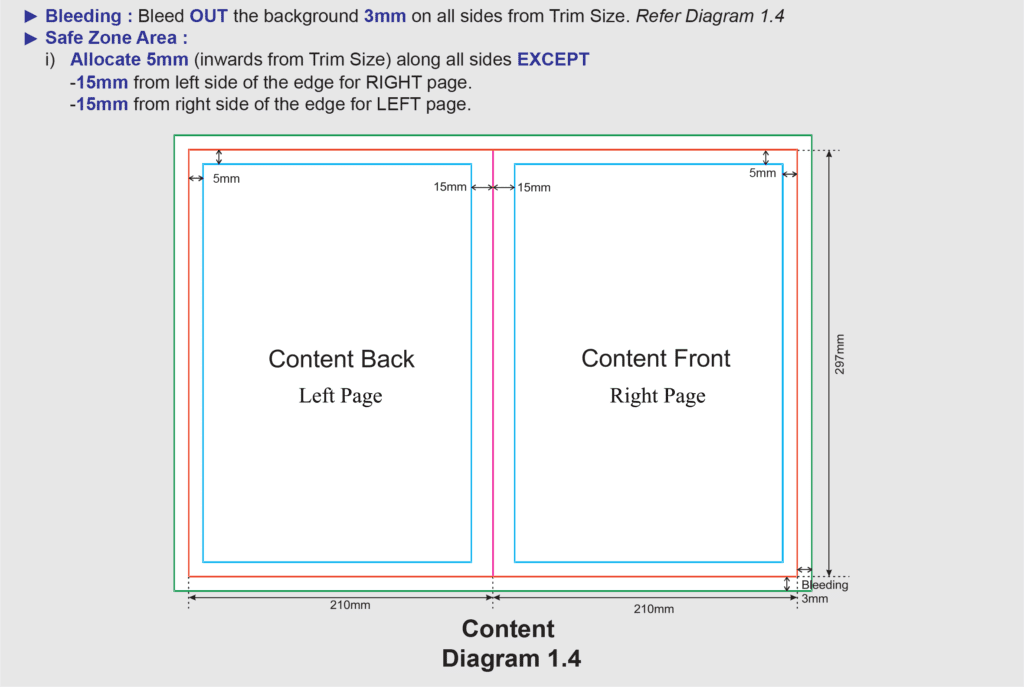- Please take note that the text and picture should kept away 15mm from the book centre, to avoid the related content from getting ‘lost’ into the binding area.