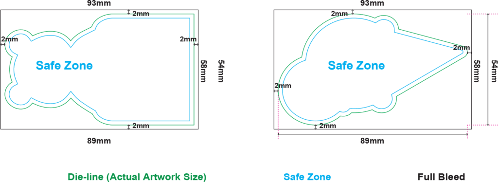 - Safe Zone: Vital elements of artwork MUST BE within the Safe Zone, 2mm from all sides of die-line.
