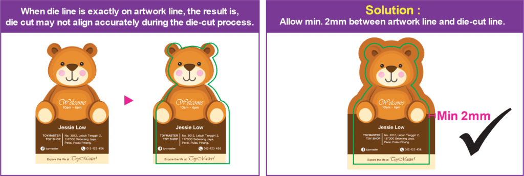 Cutting Edge Tolerance: + – 1mm Below are mis-registration scenario that can be happen during the die-cut process when die line is not correctly placed, Scenario 1: What happens when die line falls exactly on the artwork line.