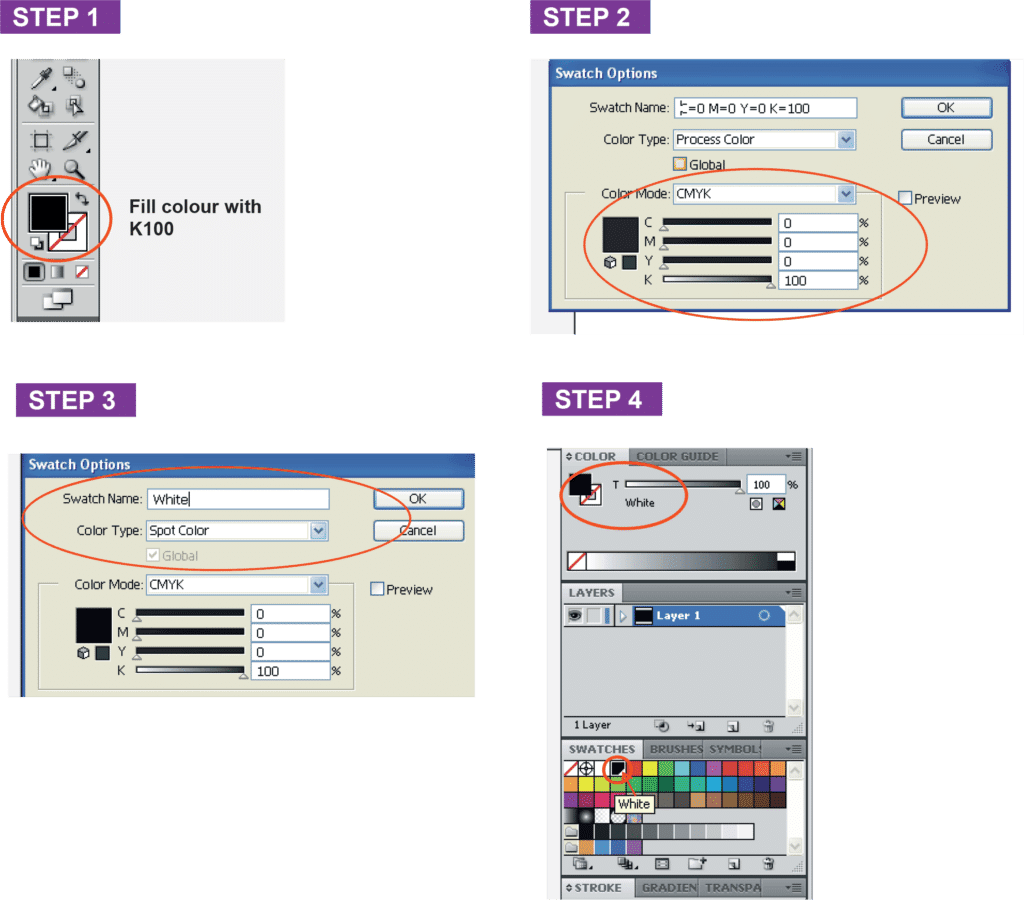 - Double confirm by checking the artwork is filled with K100 with “White” swatch name.