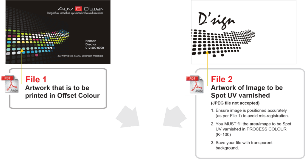 You will have to prepare 2 PDF files to apply Spot UV on your printing material.
