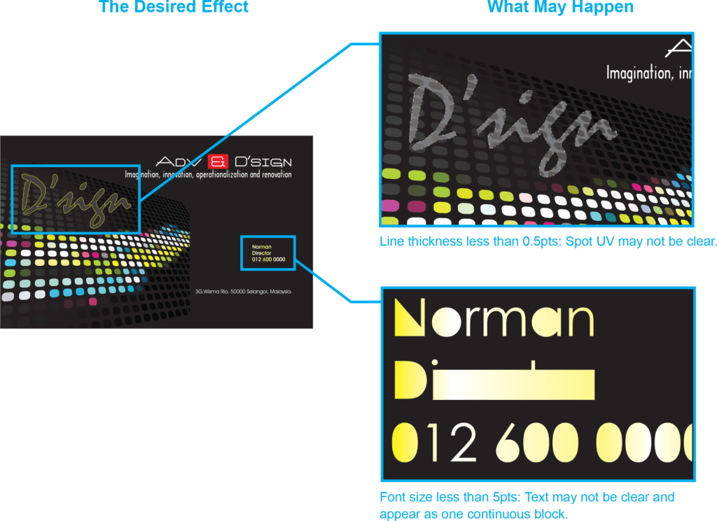 - Spot UV NOT applied to outlines or outlines of a table (Outlines may cause unattractive mis-registration more noticeable).