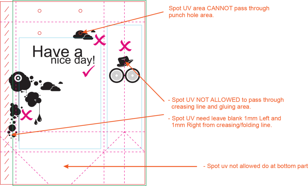 - Spot UV NOT applied along the edge/trim line, die-cut line and creasing line of artwork.