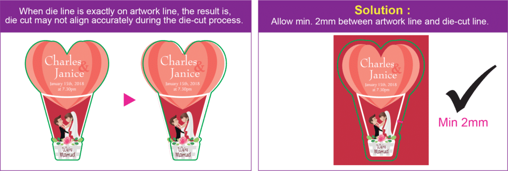 Cutting Edge Tolerance: + – 1mm Below are mis-registration scenario that can be happen during the die-cut process when die line is not correctly placed, as + – 1mm cutting edge tolerance has to be taken into consideration. Scenario 1: What happens when die line falls exactly on the artwork line