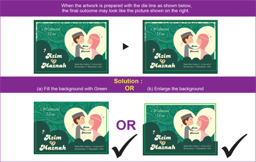 -Artwork is prepared in our Product Size Templates -Background design expand to Full Bleed size -Vital elements are within Safe Zone -No crop mark are applied