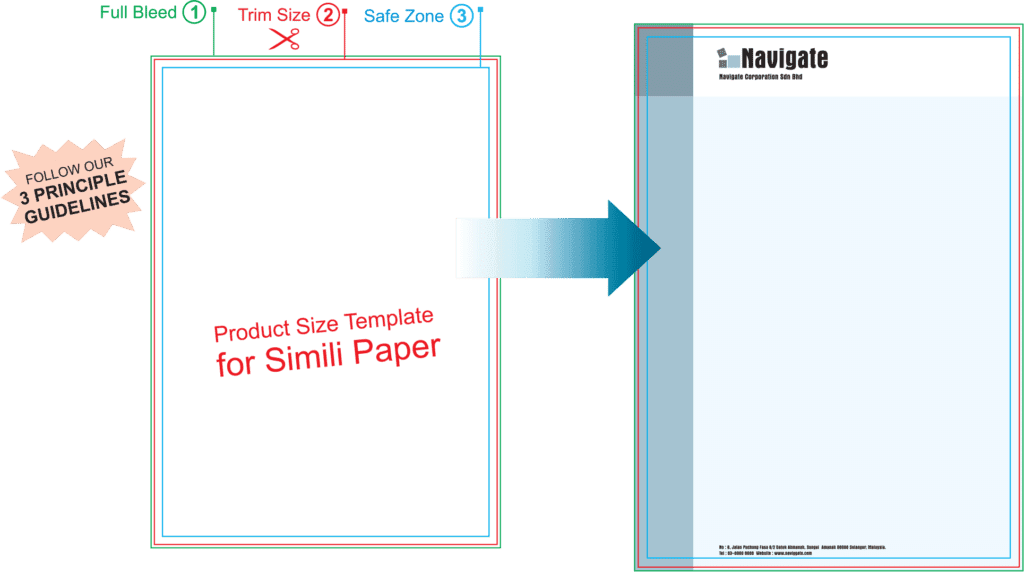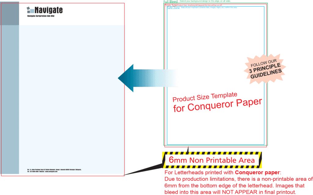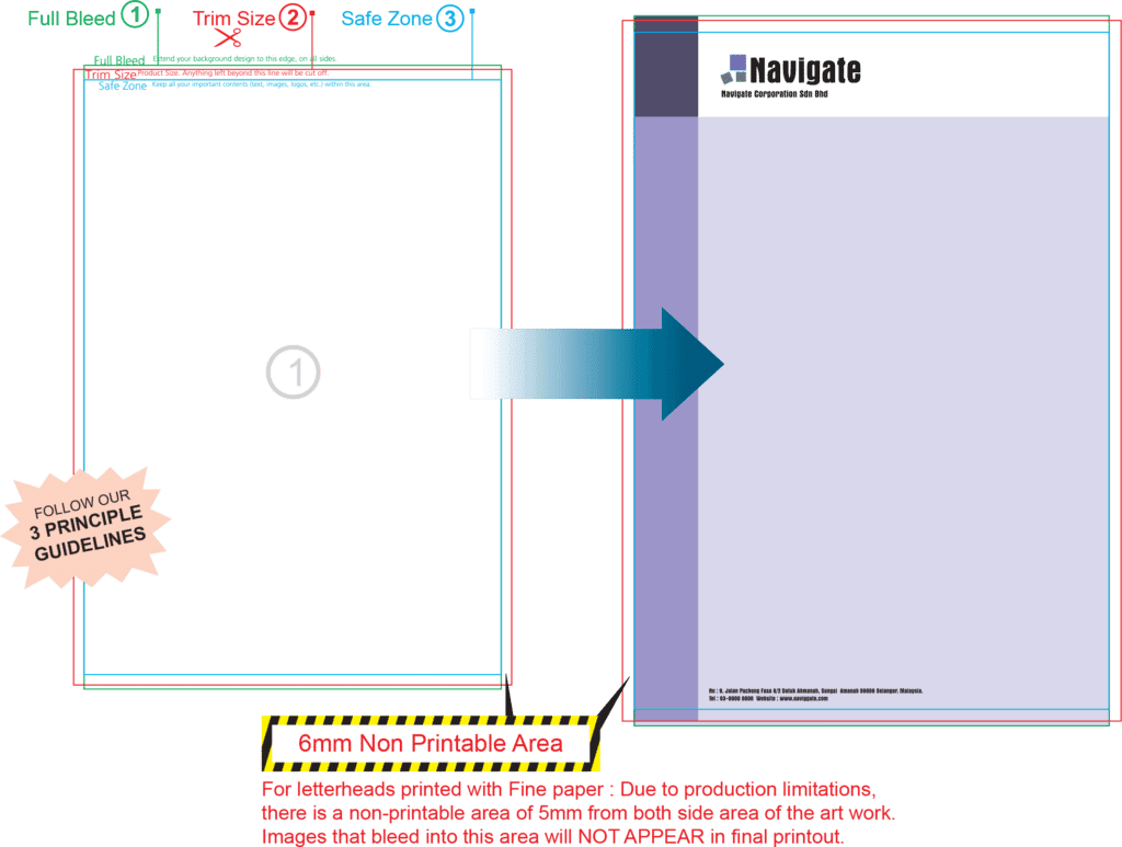 Use our digital offset product size templates for letterhead printed of FINE PAPERS. Please follow the guidelines in the respective letterhead templates when arranging your design.(Note: Due to digital offset production limitations, we cannot print full bleed to the left and right edge of letterheads that are printed on fine papers). Full Bleed Trim Size Safe Zone Please remember to design your letterhead by following the 3 PRINCIPAL GUIDELINES (Refer to GENERAL section).