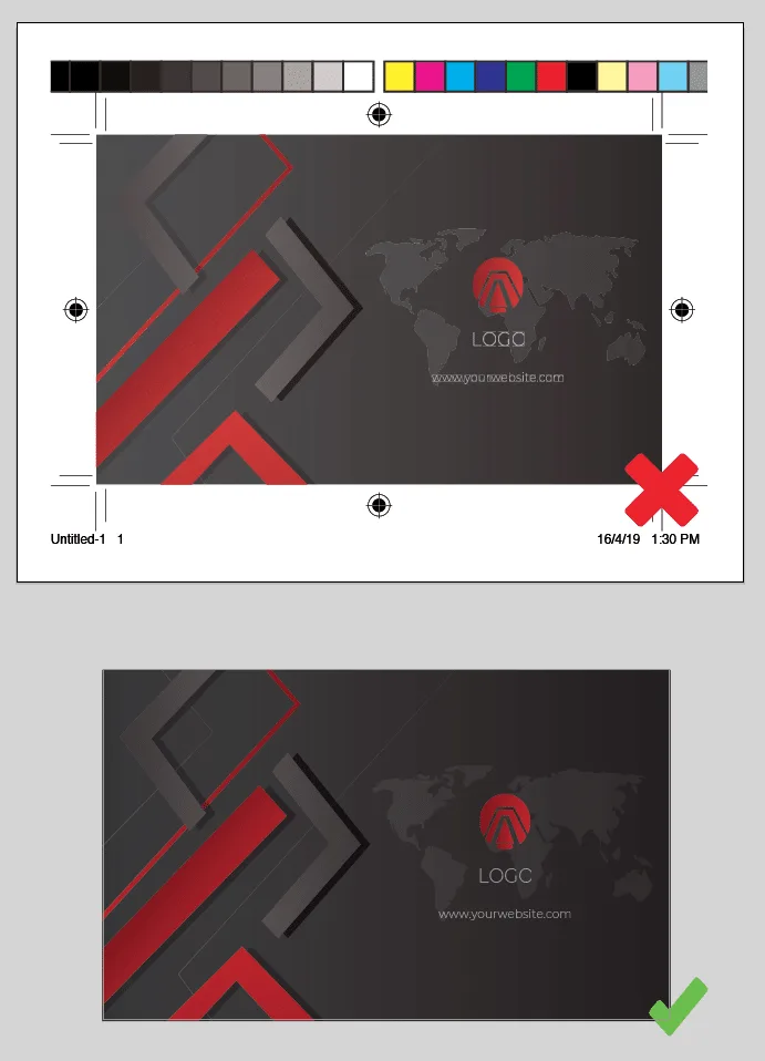 Please remove all printer trim marks and guideline when submitting your files to print. Our pre-flight system can only detect bleed size and will not be able to detect any trim marks or guideline present in the files.