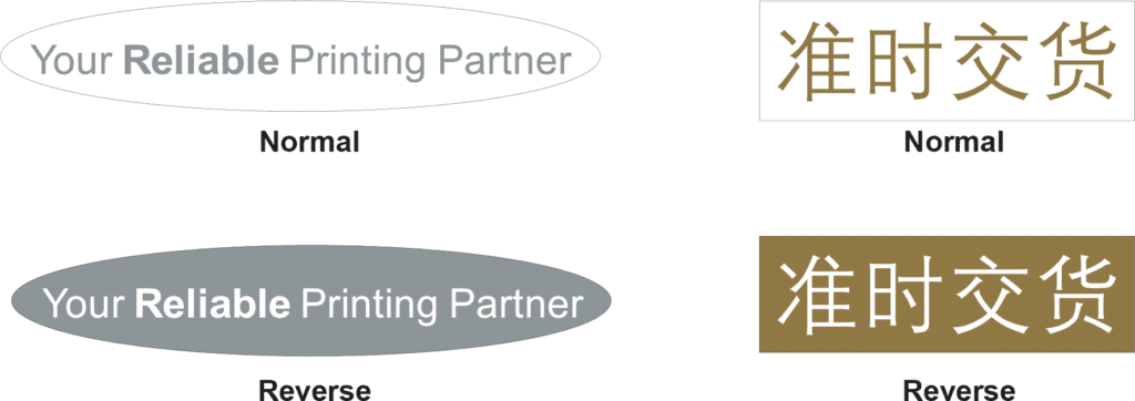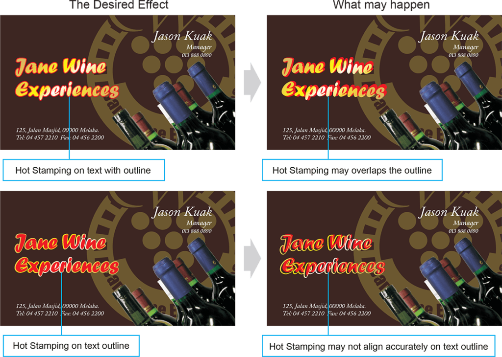Applying hot stamping on top of fonts or images require accurate registration. Here are some possible problems that may occur due to poor registration. We will not accept artwork which contains the following registration conditions as shown below.