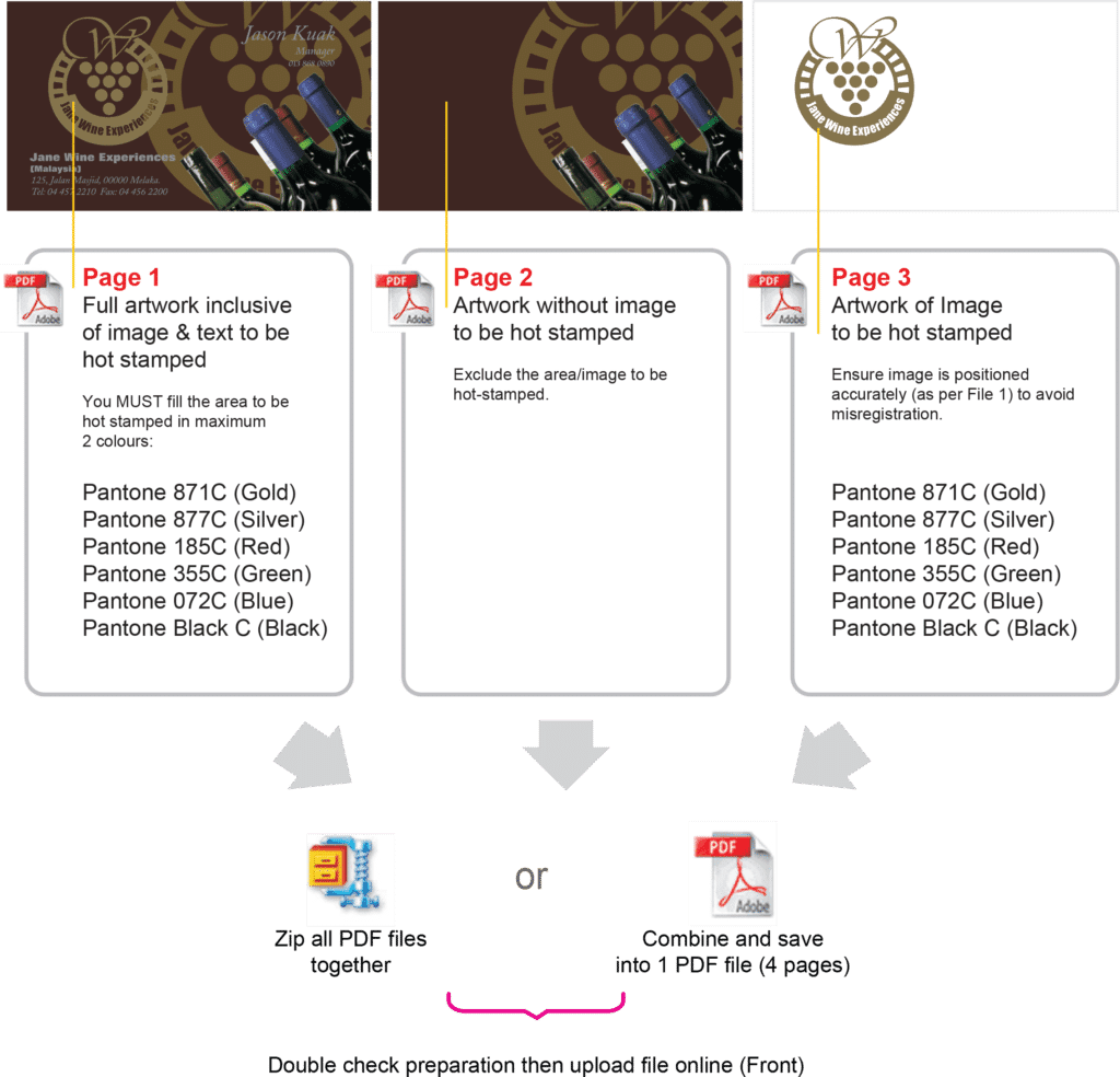 You will have to prepare 3 PDF files + 1 PDF file for Reverse Side (If applicable):