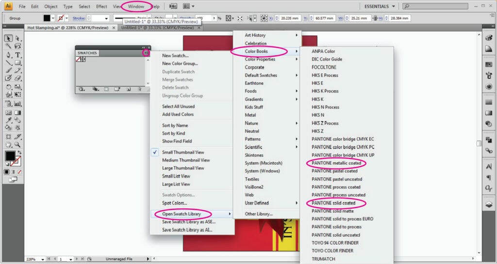 2. Select “Window” > “Swatch Libraries” > “Color Books”
