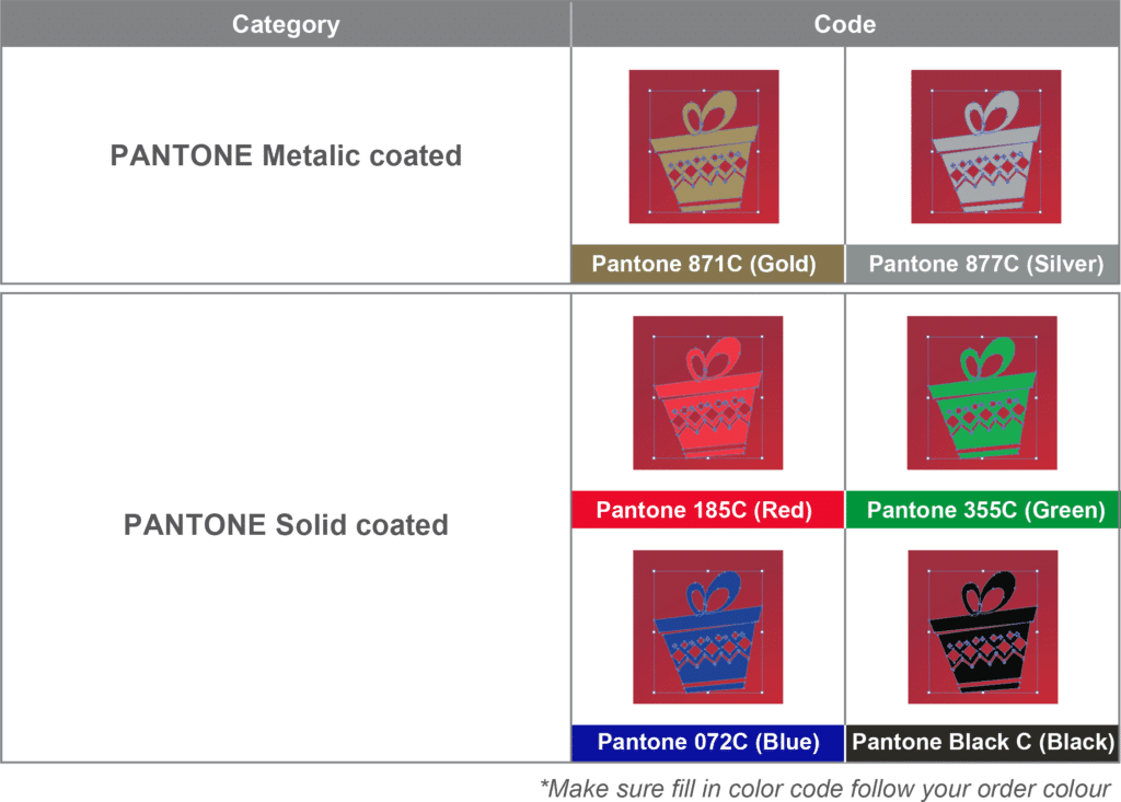 Please select the color code follow category show below to represent the hot-stamp colour: