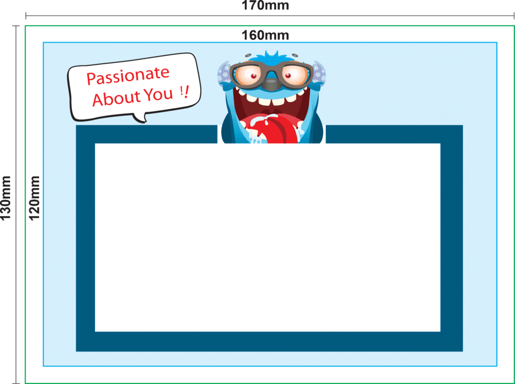 Actual Size : 130 mm x 170mm Safe Zone / Printable Area : 120mm x 160mm