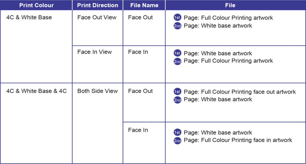 - 4C & White Base (Face Out/Face In) require to submit 1 PDF file with 2 pages.