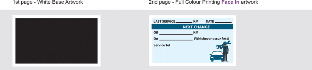 - 4C & White Base & 4C require to submit : 1 PDF file with 2 pages for Face Out. : 1 PDF file with 2 pages for Face In.