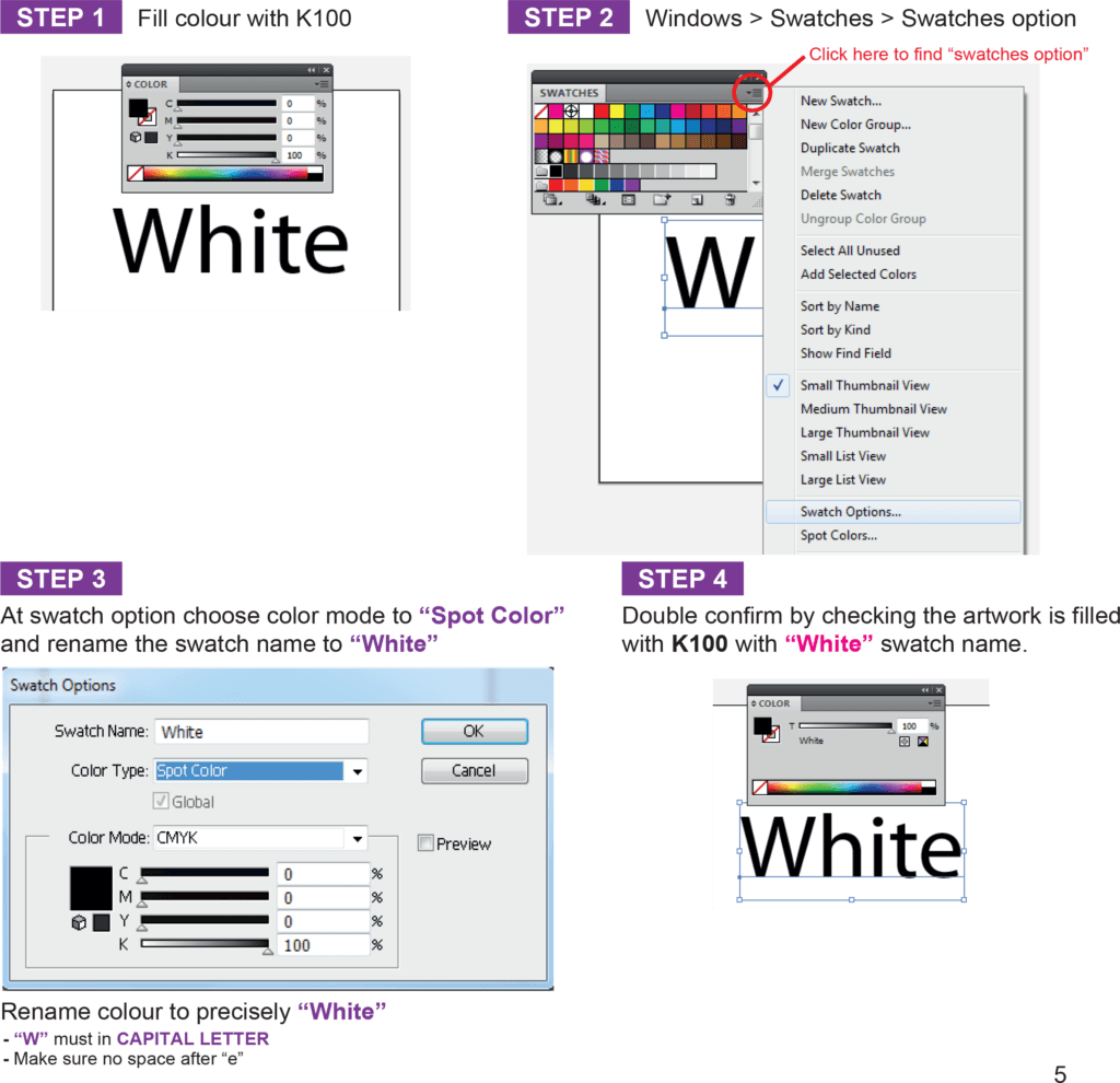 - Rename colour to precisely “White” to indicate the area of white base instead “WHITE” or “white” *Expressprint will not held responsibility on any wrong white spot colour naming error. (eg. “WHITE” or “white” or White(space) )
